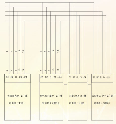 XY―2型系列產(chǎn)品廣泛應(yīng)用于冶金、電力等行業(yè)的有線對講系統(tǒng),在天車上其主站安裝在司機(jī)室,分站可以分布在電力室內(nèi)、高壓室、大小車上和天車登機(jī)門。該系統(tǒng)由若干臺廣播對講機(jī)組成一個(gè)機(jī)內(nèi)通訊網(wǎng)絡(luò),各個(gè)有線廣播站內(nèi)置揚(yáng)聲器和送受話器,任何一個(gè)廣播站喊話,其余話站均能接通廣播?梢允股a(chǎn)人員方便地與天車操作人員取得聯(lián)系。在各個(gè)站操作時(shí)無需撥號,可以方便的實(shí)現(xiàn)一對一講話,各話站并列接線,用戶可根據(jù)工藝要求任意擴(kuò)充,每個(gè)話站都是一個(gè)獨(dú)特的系統(tǒng),任一臺損壞,不會影響其余分站正常工作。在起重設(shè)備上可以方便地實(shí)現(xiàn)上下車聯(lián)系,機(jī)內(nèi)操作人員相互通訊。接線原理框圖參見附錄。