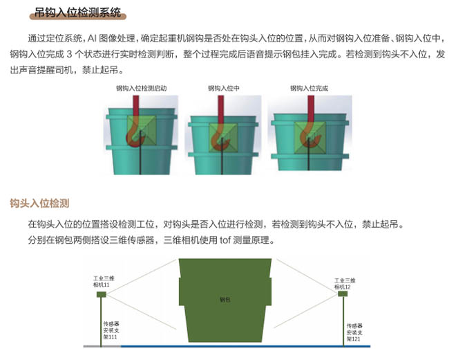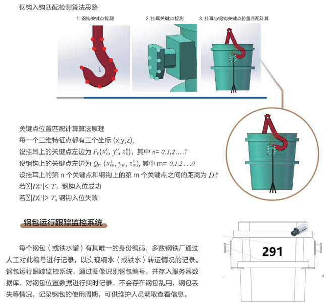 近年來,冶金行業(yè)智能化、自動化、云時代等大數據廣泛應用,煉鋼車間是冶金行業(yè)的重點區(qū)域,廠區(qū)設備復雜、環(huán)境差、安全隱患多等因素更需要進行設備自動化、智能化的升級管理、實現廠區(qū)無人化智慧工廠目標的發(fā)展。起重機作為煉鋼、煉鐵、軋鋼車間的主要設備,起重機工作中對在工位操作越來越精準,需要駕駛員及時準確觀察工位狀態(tài),由于駕駛室的位置和現場的工況環(huán)境影響經常引起操作失誤,鋼包起吊安全事故頻發(fā),特別是對于鋼包掛鉤是否完整嵌入掛耳,是否進入正確的起吊姿態(tài)沒有直接的判斷和監(jiān)控。研發(fā)起重機鋼包定位掛鉤識別管理系統(tǒng)是安全生產的剛性需求。