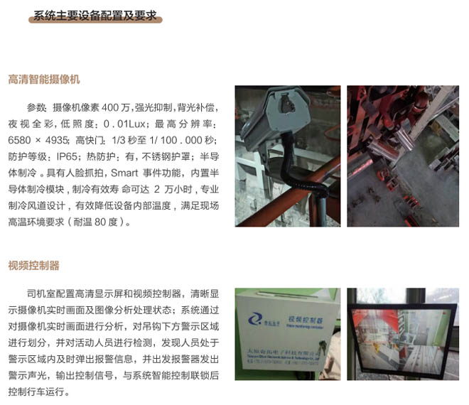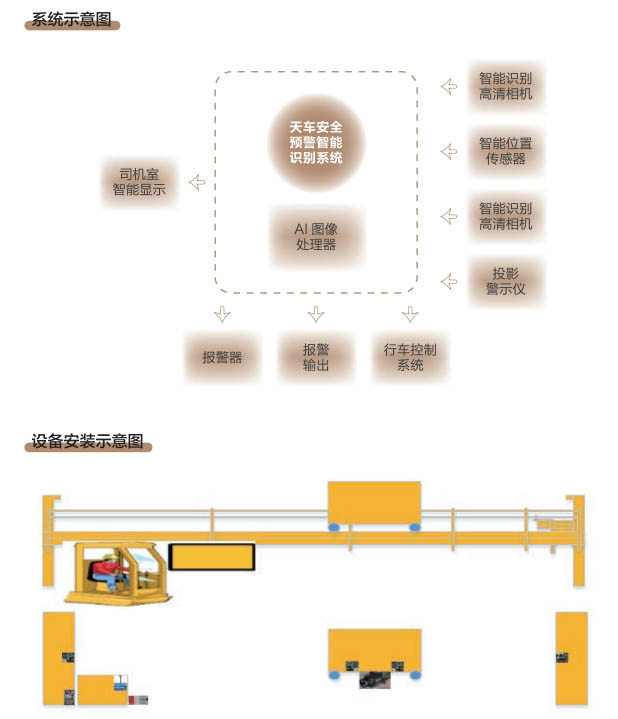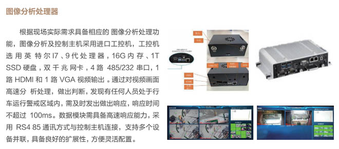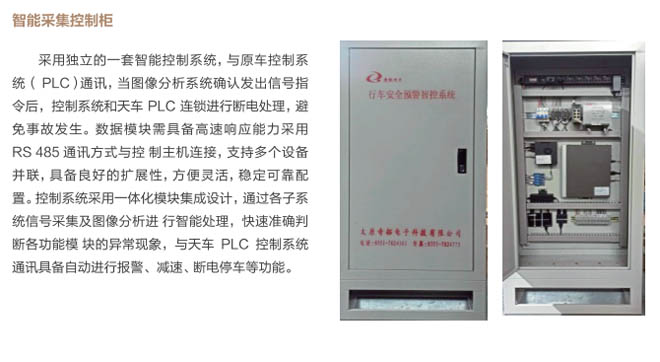 6、行車(chē)智控系統(tǒng):控制系統(tǒng)采用一體化模塊集成設(shè)計(jì), 通過(guò)各子系統(tǒng)信號(hào)采集及圖像分析進(jìn) 行智能處理,快速準(zhǔn)確判斷各功能模 塊的異,F(xiàn)象,與主機(jī)PLC控制系統(tǒng) 通訊連接具備自動(dòng)進(jìn)行報(bào)警、減速、斷電停車(chē)等功能,當(dāng)系統(tǒng)確認(rèn)發(fā)出信號(hào)指令后,控制系統(tǒng)和行車(chē)PLC連鎖進(jìn)行斷電處理,避免事故發(fā)生。