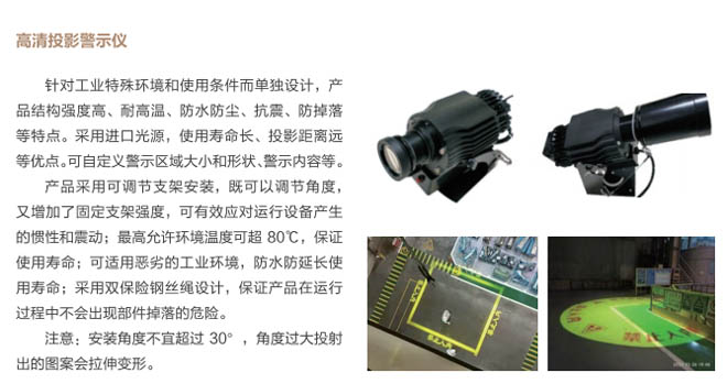 1、區(qū)域警示系統(tǒng):在行車(chē)小車(chē)底部增加一臺(tái)工業(yè)警示儀,投影到行車(chē)吊鉤下方6米范圍內(nèi)作為警戒區(qū)、4米范圍內(nèi)作為危險(xiǎn)區(qū)(警示區(qū)域可自行設(shè)定區(qū)域范圍大小及圖像形狀和文字內(nèi)容)