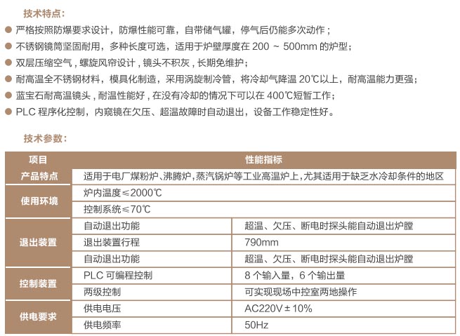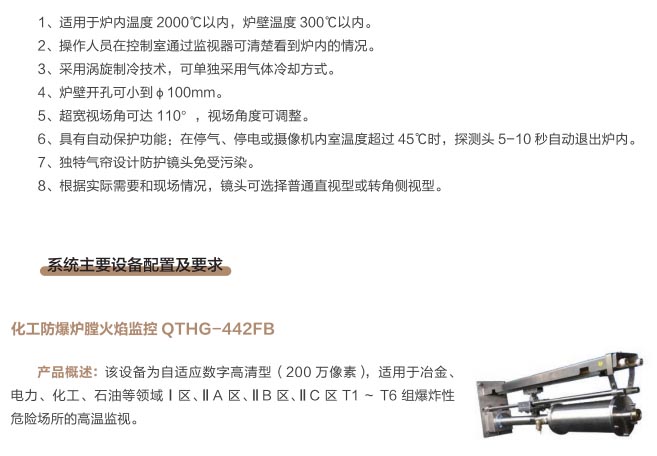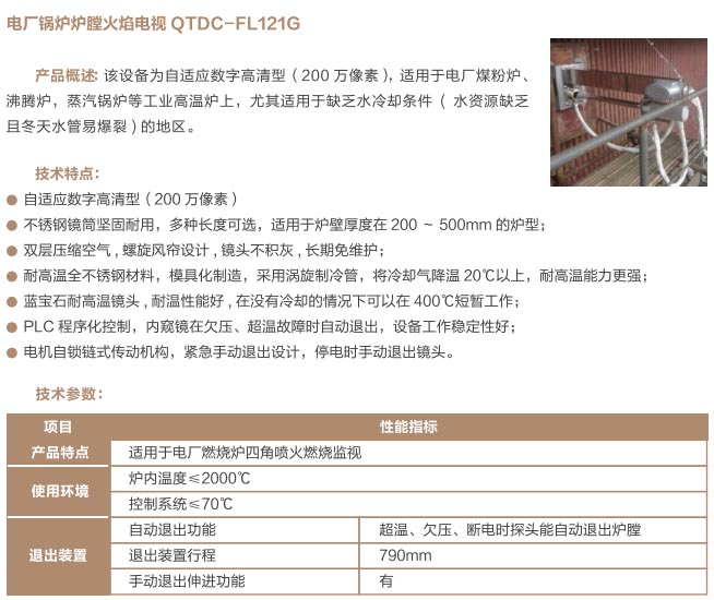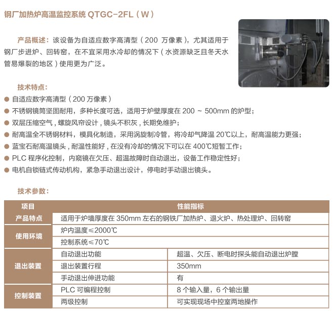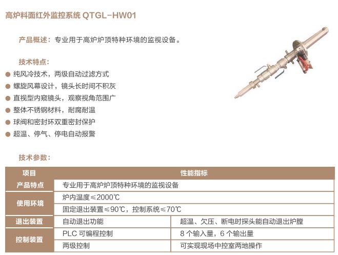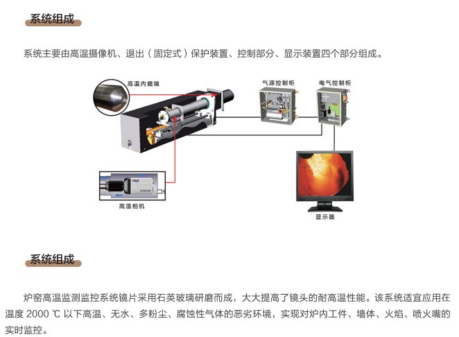爐窯高溫監(jiān)測監(jiān)控系統(tǒng)是專為工業(yè)高溫爐窯監(jiān)測監(jiān)控的設計的智慧管理平臺,是針對爐壁開孔和爐窯視像有嚴格要求的高溫爐窯而研制的高溫工業(yè)電視。利用特種高溫孔式光學鏡頭,鏡頭設計采用中繼物鏡,兩次成像系統(tǒng),使像面在遠離觀察孔的CCD靶面上形成,最大限度的減少進入攝像機的熱輻射,致力為冶金、電力、建材、礦山、化工等行業(yè)服務。我公司研發(fā)主導產(chǎn)品已擁有第三代SG內(nèi)窺式高溫工業(yè)電視系列、爐壁式高溫工業(yè)電視系列、內(nèi)窺式拐角高溫工業(yè)電視系列、鍋爐汽包水位電視系統(tǒng)等成套設備,以及各種風冷防護罩,水冷防護罩,渦旋制冷防護罩等工業(yè)監(jiān)控設備配套產(chǎn)品。產(chǎn)品廣泛應用于鋼鐵廠加熱爐、退火爐,電廠鍋爐爐膛火焰、水泥廠回轉(zhuǎn)窯窯頭看火、篦冷機看料、玻璃廠玻璃熔窯等特殊高溫環(huán)境。幫助用戶進行工業(yè)爐實時電視監(jiān)測及控制,解決設備的運行故障等,對用戶改善產(chǎn)品質(zhì)量、降低成本、安全生產(chǎn)有著獨特的成效。受到了用戶的一致好評。